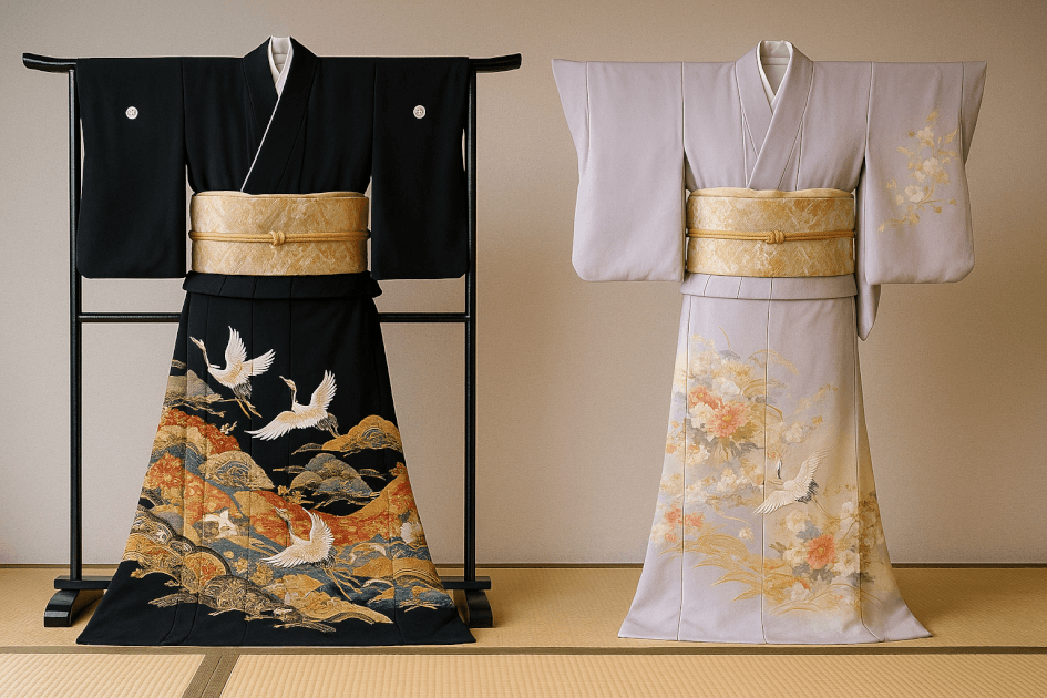 黒地に五つ紋が入ることが基本で、裾には華やかな絵羽模様が広がります。
