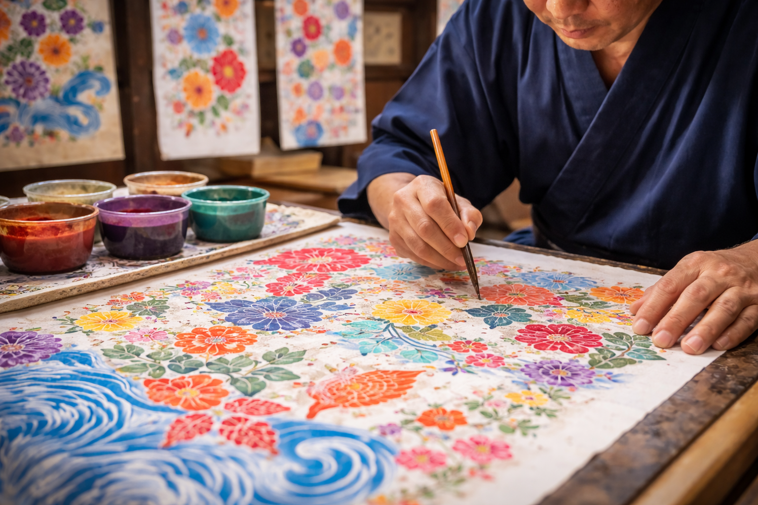 糊置きによって文様の輪郭を保ち、顔料や染料で一色ずつ彩色します。