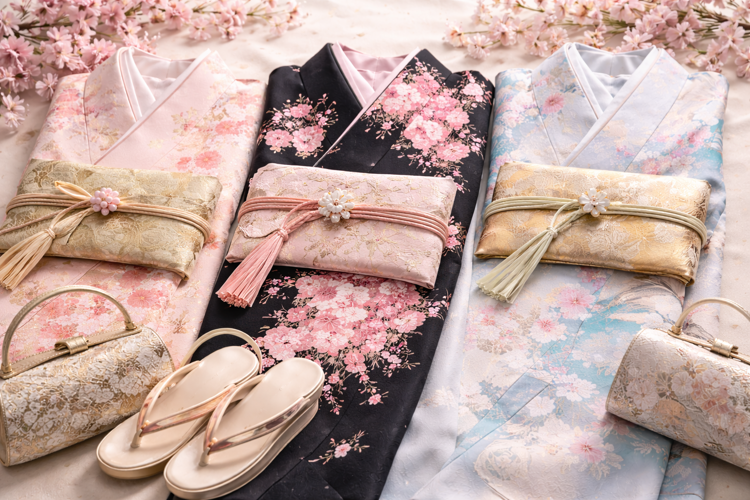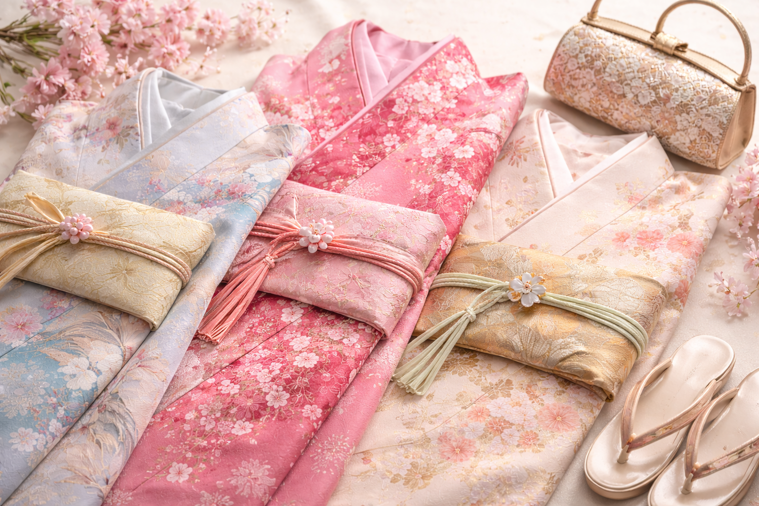 - 桜着物の小物は柄色を一色拾うと統一感が出る